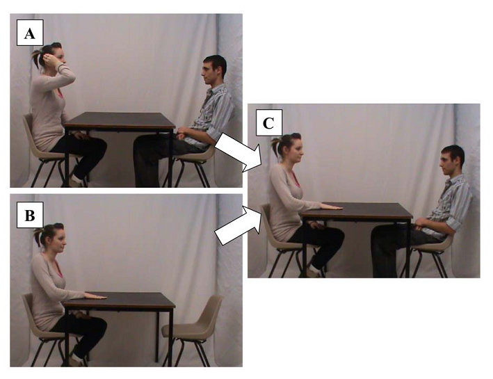 Figure 1. Doctored video clip. (A) Real clip. (B) Fake action. (C) Doctored composite of (A) and (B). From Clark, A., Nash, R. A., Fincham, G., & Mazzoni, G. (2012). Creating non-believed memories for recent autobiographical events. PLoS ONE, 7(3): e32998. Copyright 2012 by Andrew Clark. Reprinted with permission.
